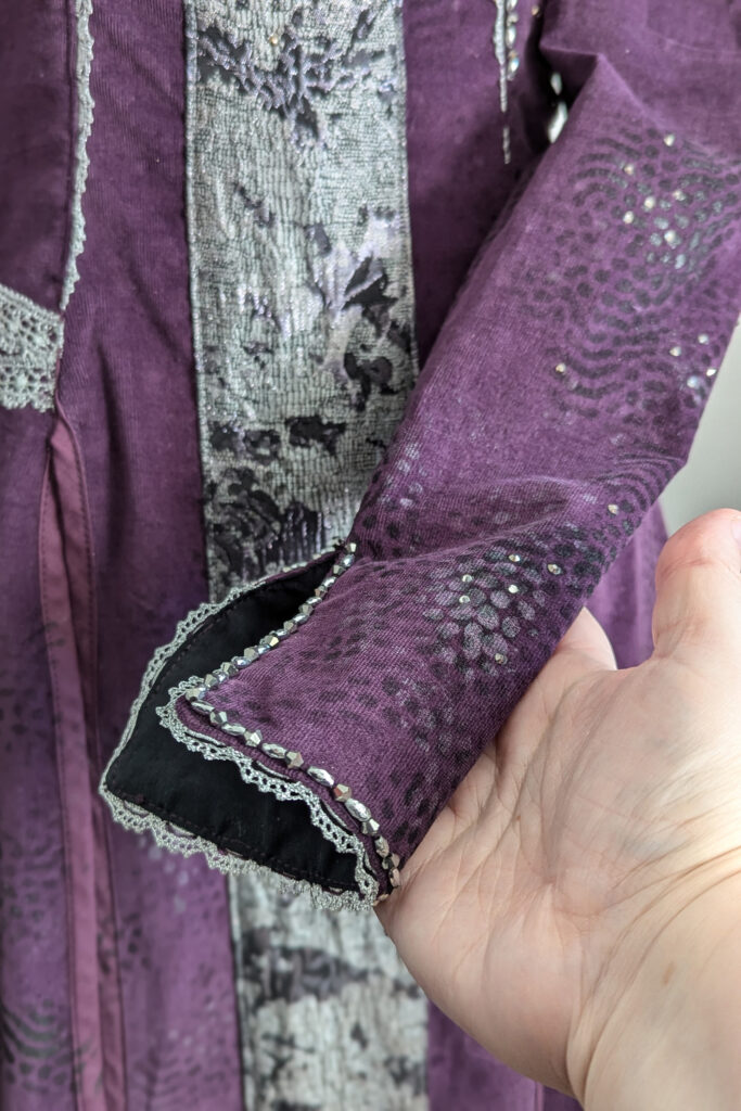 Velours violet, simili-cuir, dentelles argentées, peinture, strass