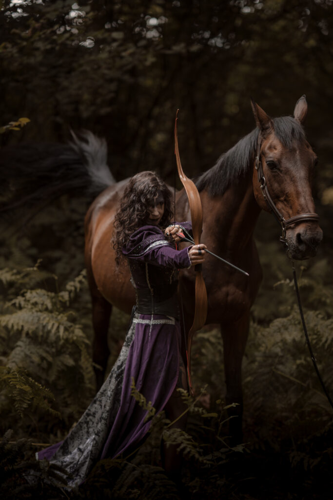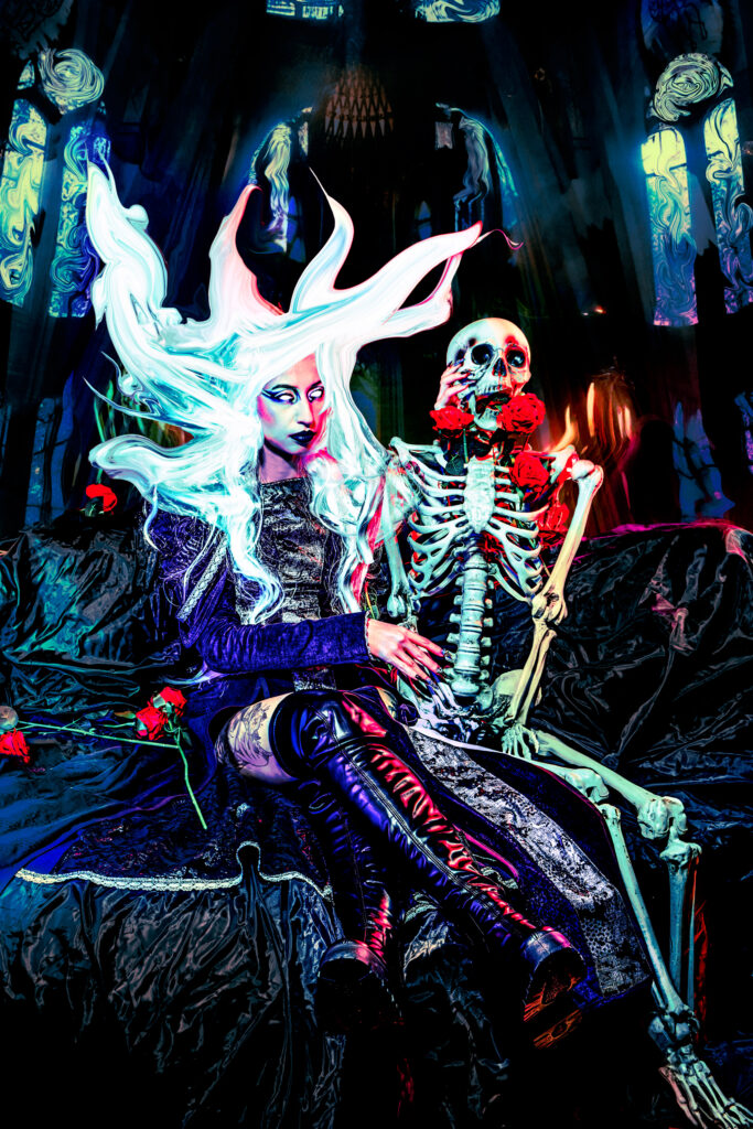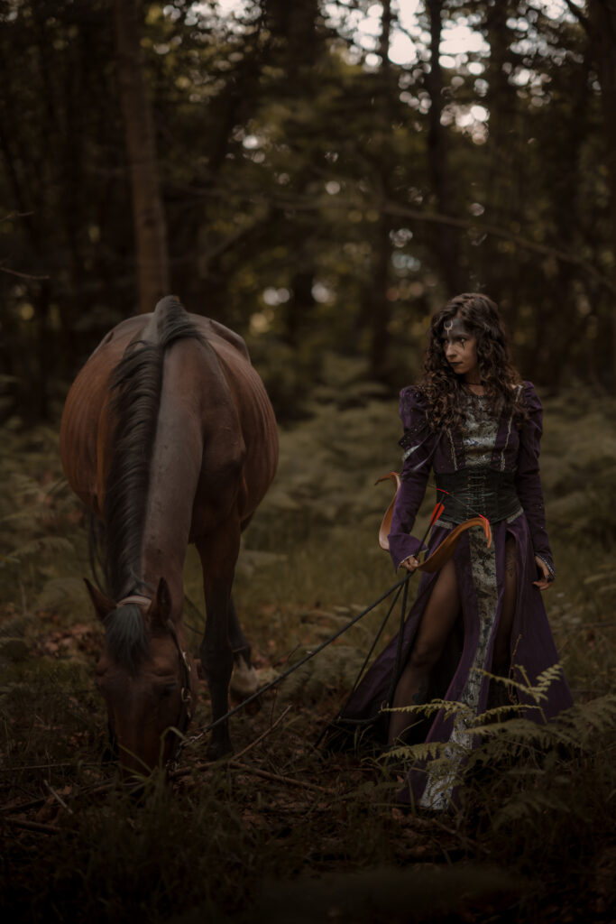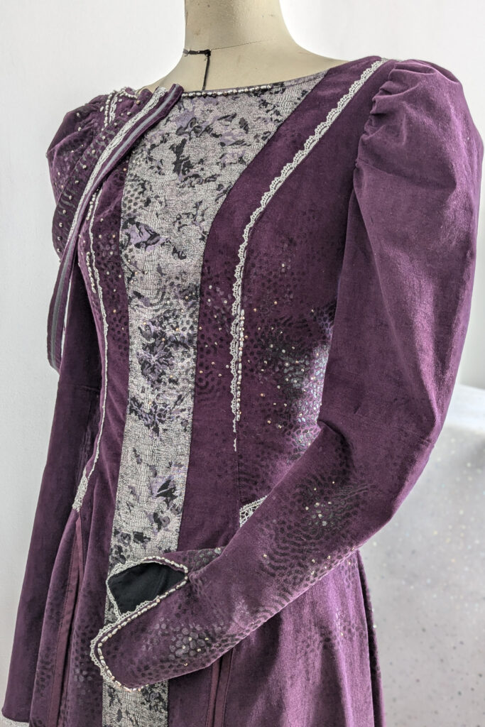 Cette robe de velours, rebrodée de perles et peinte à la main, est ornée de dentelle argent. Elle se prête aussi bien à un personnage royal et théâtral qu’à une elfe noire ou une figure de dark fantasy.